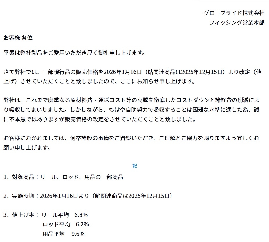 また、メーカー様によっては今月半ば頃に大幅値上げの告知も出ております!ロッドやリール、クーラーなどの大型雑品など、購入を検討されているお客様は今買っておくのが良いですよ(^^)