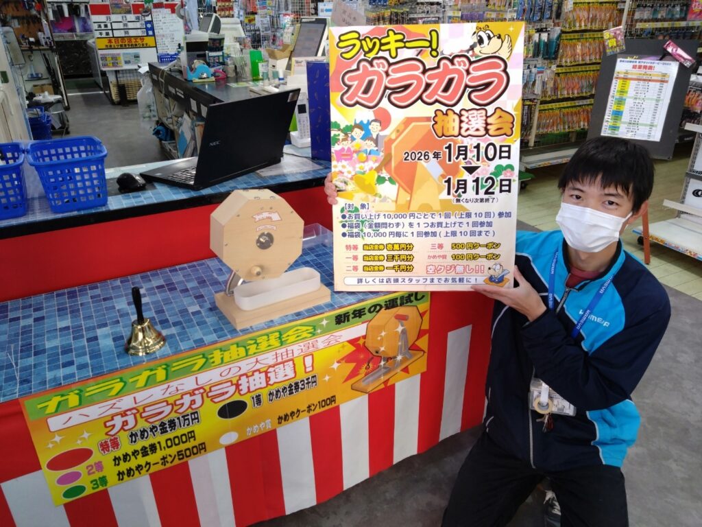 本日、ガラガラ抽選会🎯&かめや宝くじ🐢当選発表日✨フィッシング都城
