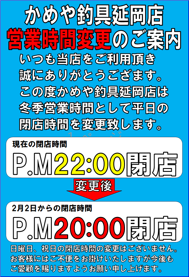 ※営業時間変更のご案内-かめや釣具延岡店-