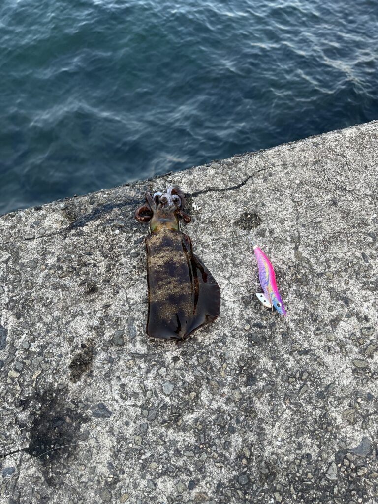 風も強くてとてもアタリが取りづらく、これは釣れないだろうと思っていましたが、日が昇ってすぐの時間帯にエギをキャストしてフリーで沈めていたら、糸が出て行かないので合わせてみたところしっかりとイカでしたね。
