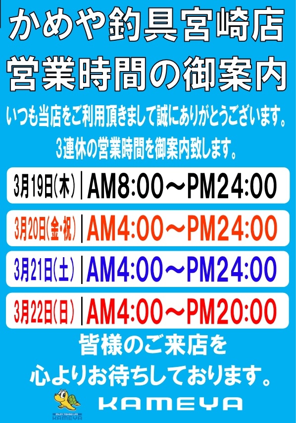 祝日でも24:00まで営業しておりますので、夜釣りや早朝からの釣行予定がある方は是非お立ち寄りくださいませ♪(^o^)