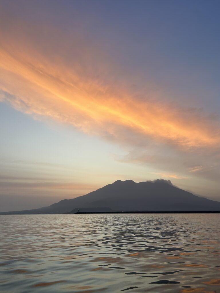 朝焼けの桜島を眺めポイントに向かいます。この景色も、錦江湾ならでわの景色。最高です。