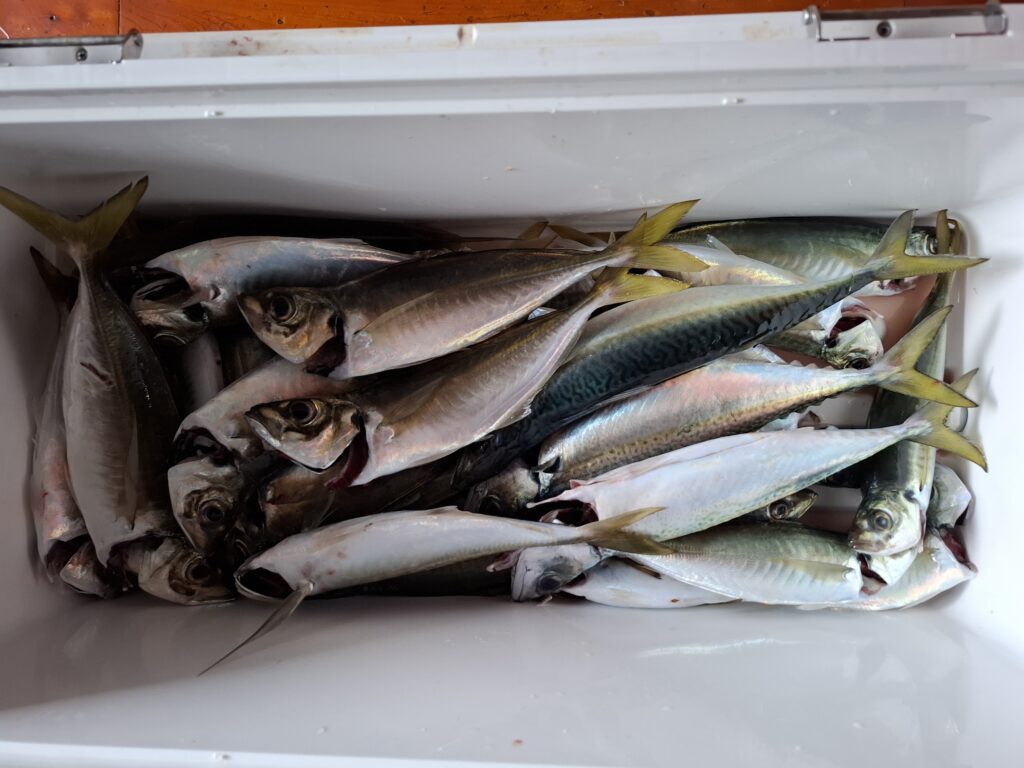 終日、爆釣状態でこのままだと料理をするのを考えてゾッとしたので途中からは泳がせをしたりと、のんびり釣りをしても良型のアジ・サバがこの釣果(^^)v