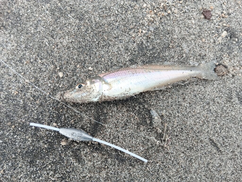 普段キス釣りにはジェット天秤や重たいシンカーを使う方が多いかと思いますが、私の行く場所は小場所が多いため、着水音に敏感なキスにはこの仕掛けをチョイスしました。エギングタックルでは最高に使い勝手が良いです。