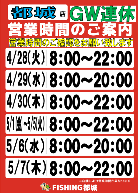 👇フィッシング都城のGW期間営業時間のお知らせになります!👇