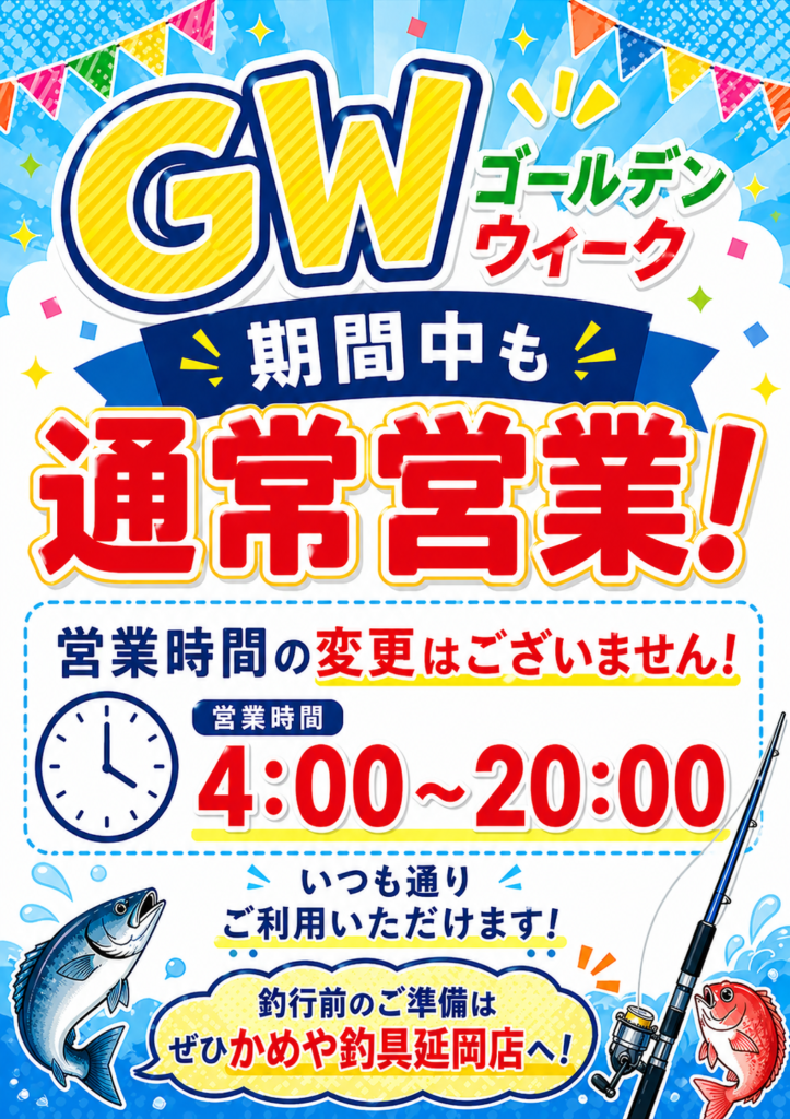 かめや釣具延岡店はゴールデンウィーク期間中の営業時間の変更を行わず通常通りに営業致します