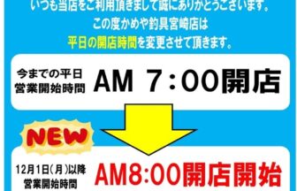お世話になります。宮崎店です!皆様に営業時間変更のお知らせが御座います。12/1より平日の開店時間がAM8:00となりました!…
