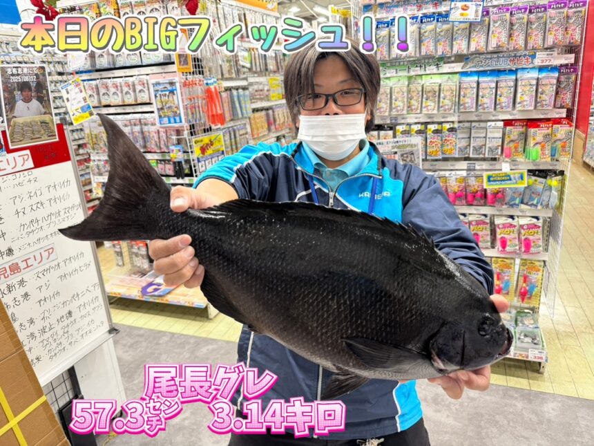 本日、超BIGサイズの尾長グレをお持ち込み頂きました!!沖磯での釣果でサイズはなんと!57.3㌢ 3.14キロ✨️BIGフィッシュおめでとうございます🎉