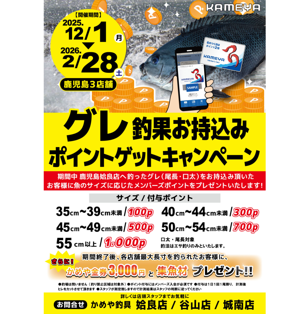 釣法問わず、エサ釣りであれば対象となり、大きさに応じて最大1000ptのかめやメンバーズポイントを進呈致します!