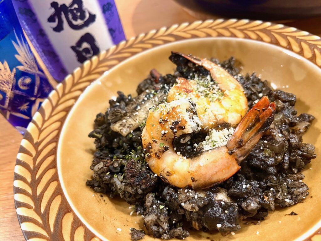 ニンニクと玉ねぎ、エビとイカを炒めて米も炒めてお塩、トマト缶とイカ墨と白ワイン。