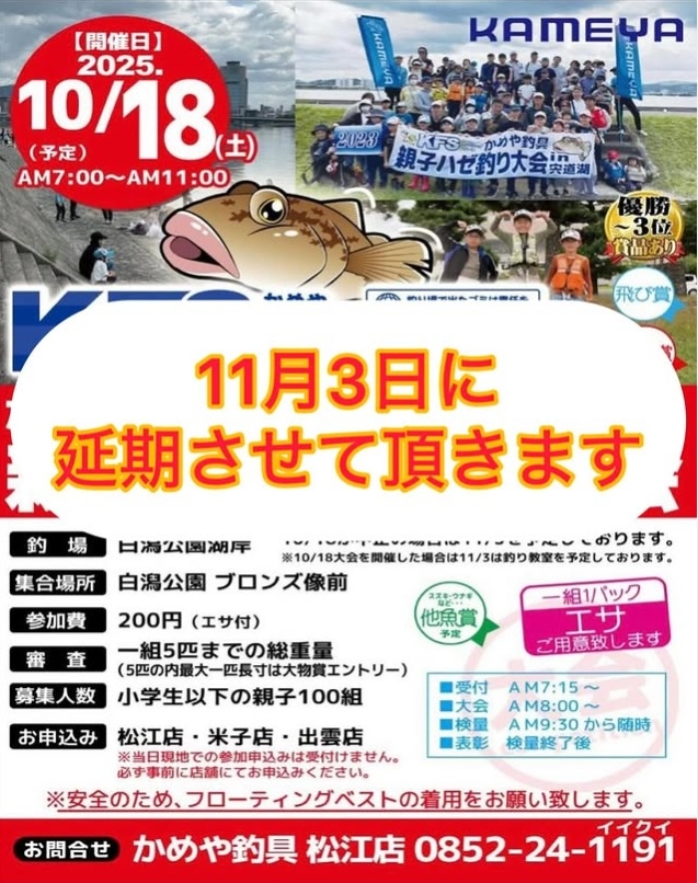 かめや釣具 親子ハゼ釣り大会 in 宍道湖 順延のお知らせ