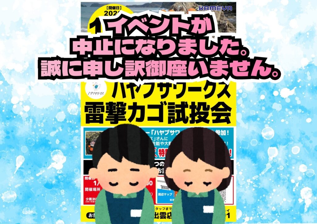 かめや釣具出雲店です。この度、強風予報の為1月11日(予備日1月12日も同様)に予定しておりましたハヤブサワークス雷撃カゴ試投会ですが、お客様の安全面を考慮し誠に勝手ながら中止させて頂く事になりました。ご来場を楽しみにされていたお客様には、多大なご迷惑をお掛けし、誠に申し訳ございません。何卒ご理解を賜りますようお願い申し上げます。