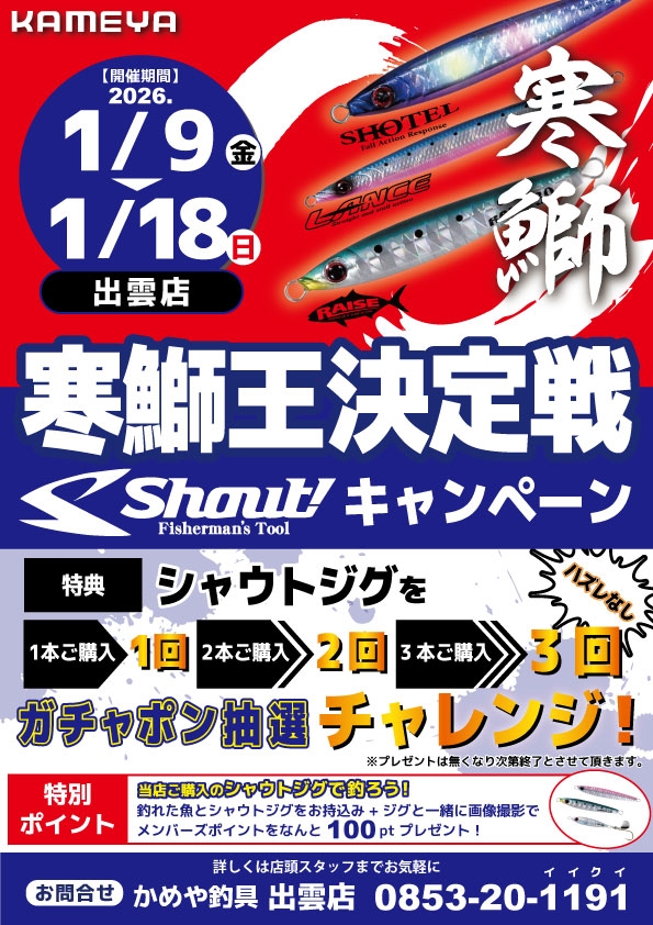 期間中にシャウト!ジグをお買上げでガラポン抽選にチャレンジできます!!