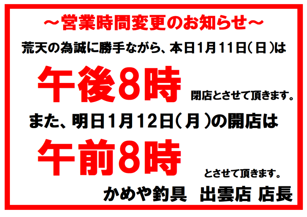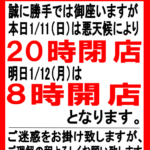 荒天の為、誠に勝手ながら本日は午後8時閉店、明日は午前8時開店とさせて頂きます。