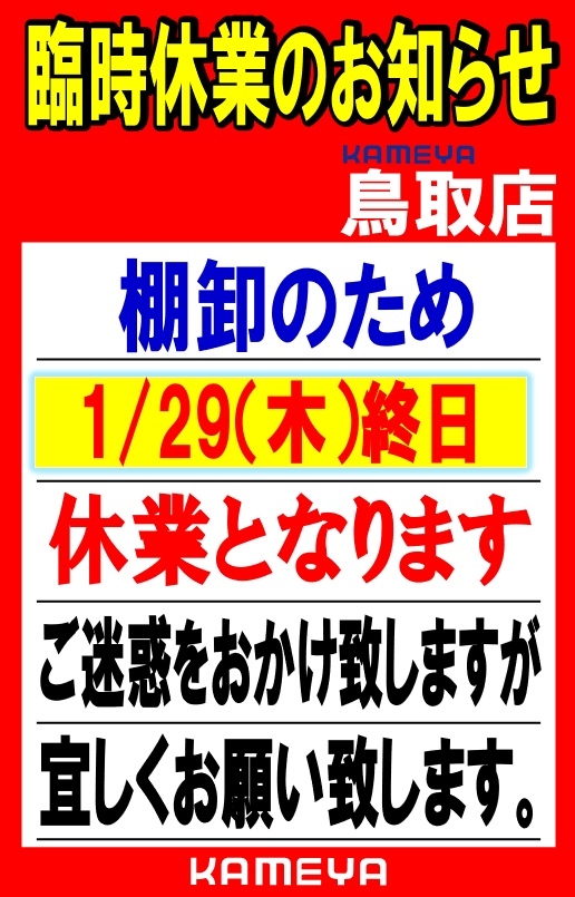 1/29(木)は棚卸の為、終日休業とさせていただきます。