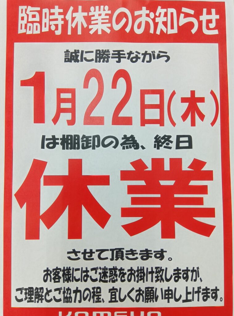 明日は棚卸の為、休業日となります。