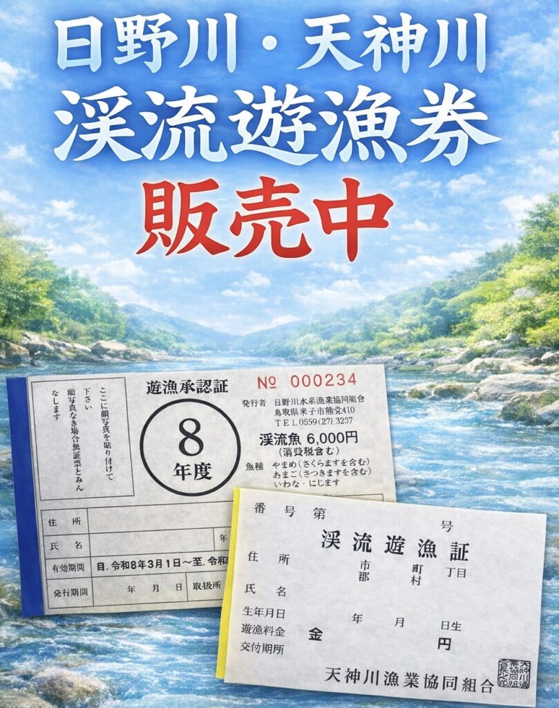 日野川、天神川、ともにご機嫌な遊漁券を販売中でございますよ。