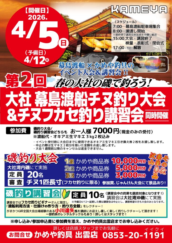 大会の受付はオキアミ引換券などの都合上、出雲店のみとしております!