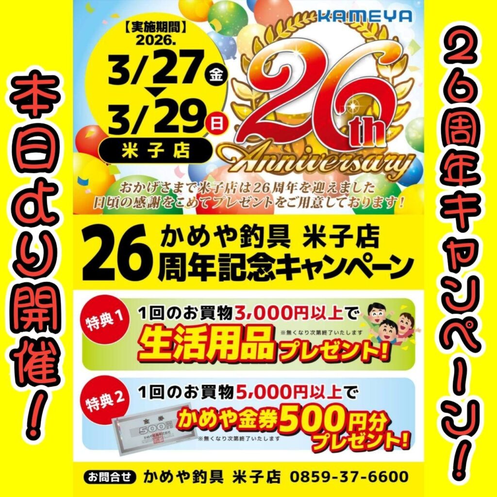 本日より【かめや釣具米子店 26周年キャンペーン】を開催しております🔥