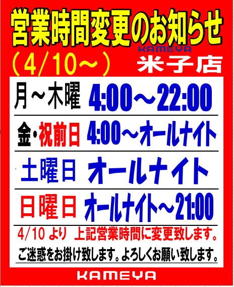 4/10より営業時間変更のお知らせです!