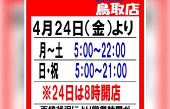 かめや釣具鳥取店です。今週末より営業時間が変更となります。開店時間は5時。閉店時間は月~土は22時、日曜や祝日は9時閉店…