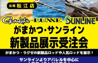 どうも、松江店の井上です(^o^)/3/20~22の間、がまかつ様とサンライン様の新製品受注展示会を行います!!新製品・人気ロッ…