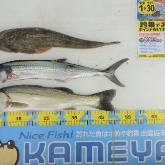 釣行日 202511.5 釣行者 30H様 釣行場所 神戸川サーフ 釣果 マゴチ50cm、シーバス50cm、サゴシ55cm タックル ル…