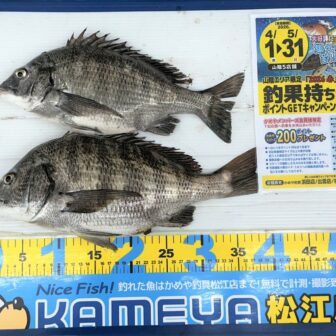 釣行日 2026.4.14 釣行場所 中海 釣果 チヌ 2匹 最大40㎝ タックル オキアミ お持ち込みありがとうございます♪中海でチヌ2…