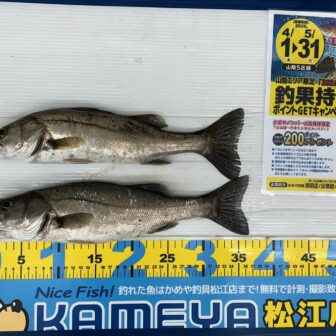 釣人 : Tさま釣行日 : 2026年4月12日釣場 : 宍道湖・白潟公園釣果 : シーバス(スズキ) 最大38㎝ 合計 2尾釣法 : 餌→青虫 にてお客様より、シーバス(スズキ)の…