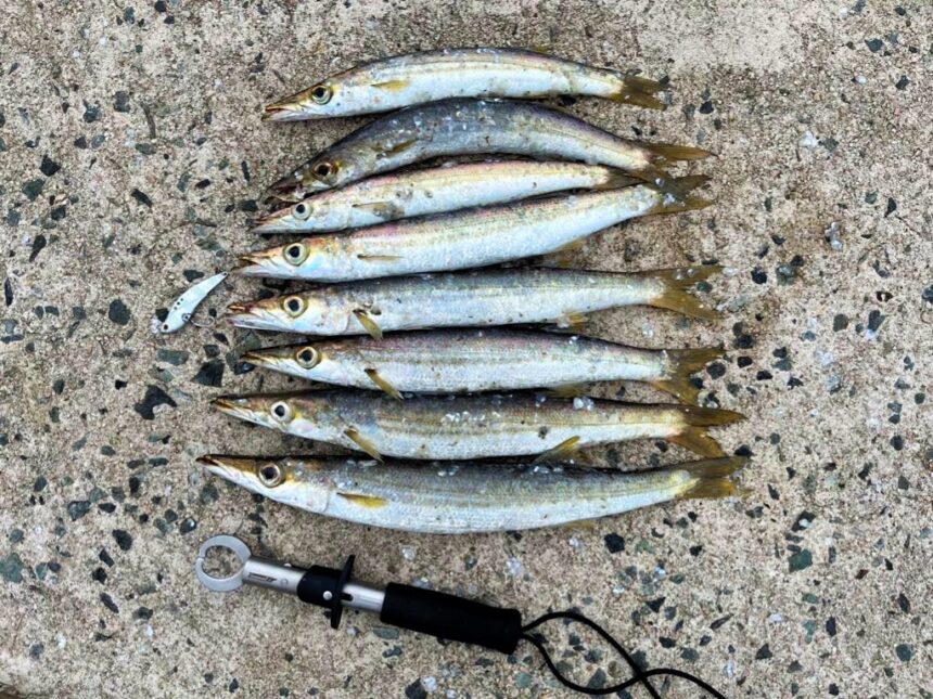 短い時合でしたが、8匹の30㎝以上のカマスが入れ食いでした!