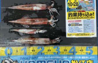 お持込みありがとうございます\(^o^)/大漁です!!エギは、ダイワ エメラルダスダードⅡ 3号キャスト後のフォールだけでも釣れたそうです。まだまだアオリイカ絶好調です♪♪♪皆様のお持込みおまちしておりますm(__)m