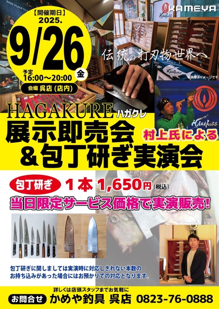 かめや釣具呉店では継続して、HAGAKURE様の包丁を店頭でも販売させて頂くことになりましたので、是非ご来店ください
