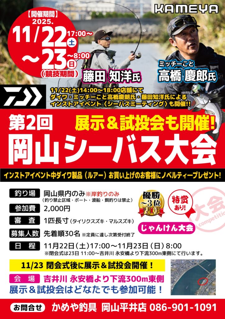 かめや釣具岡山平井店では、第2回岡山シーバス大会の参加者を募集中です✨