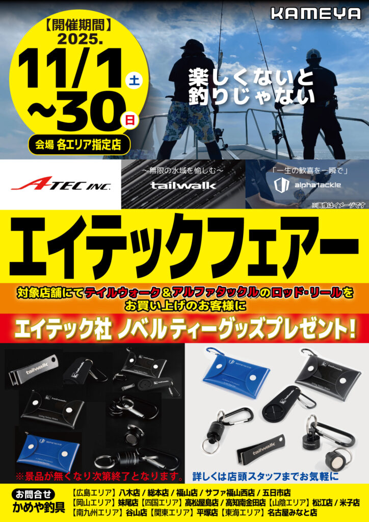 その対象店舗にてエイテック(テイルウォーク・アルファタックル)のロッド・リールいずれかご購入でノベルティグッズをプレゼント🎁✨