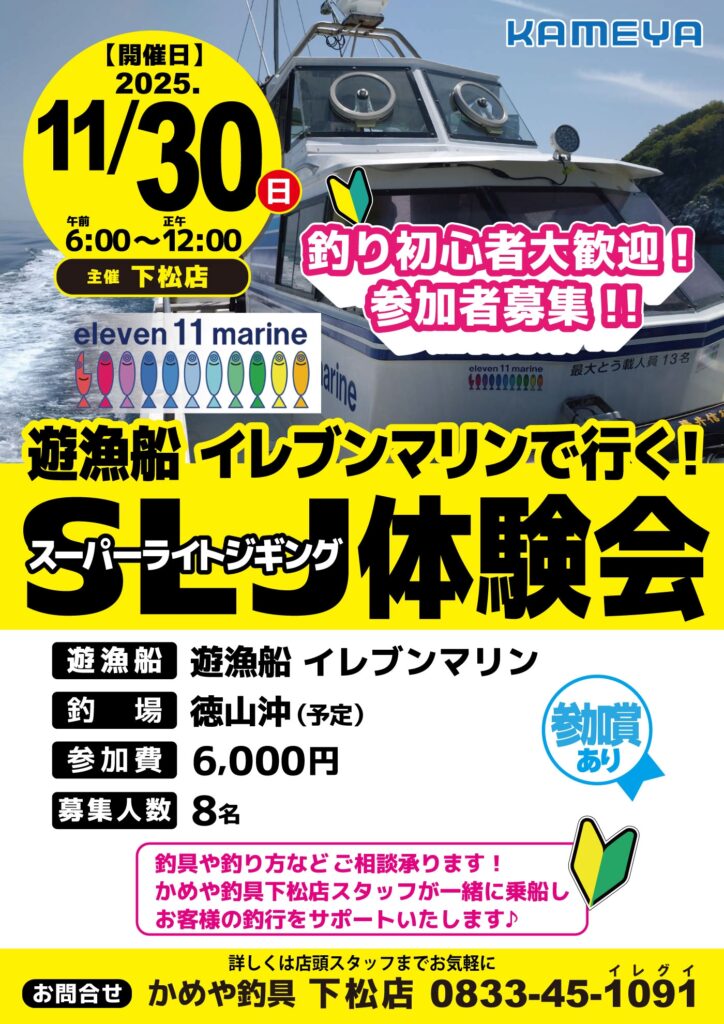 皆さんこんにちは!!!かめや釣具下松店です!!!青物が好調です🔥イベントのアナウンスになります🎣11月30日に遊漁船イレブンマリン様でSLJ体験会を開催いたします✨時間は、6:00~12:00までとなっております( *´艸`)集合場所は、徳山ポートビル近くの徳山港になります!!!現在、好調の青物に行ってみませんか⁉募集人数は8名となっておりますので、お早めに!!!