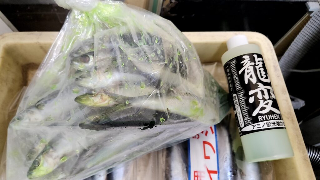 イワシとサンマ。これは漬け込む事でエサが紫外線発光するようになる