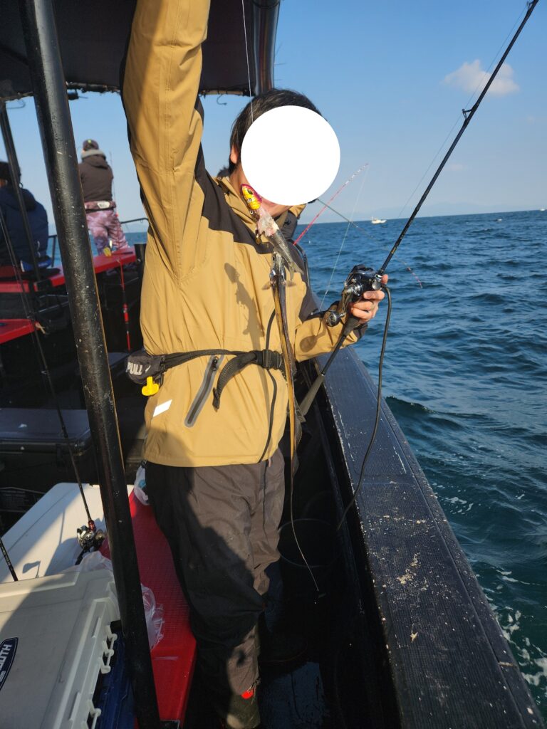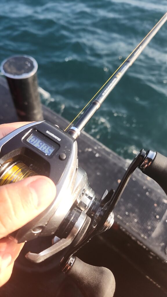 朝方は水深60m付近で釣れていたので手巻きでもいけるなぁという