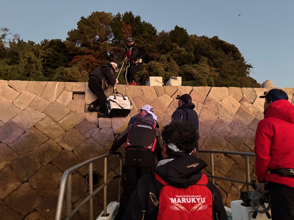 磯と波止に交代で降りチヌ2匹の大きさの合計を競います。