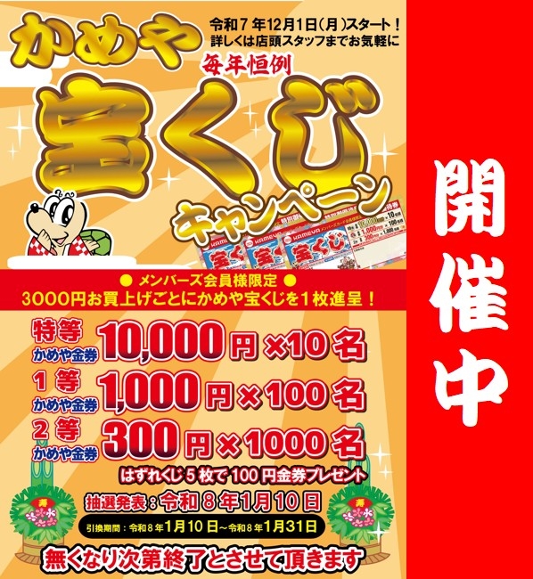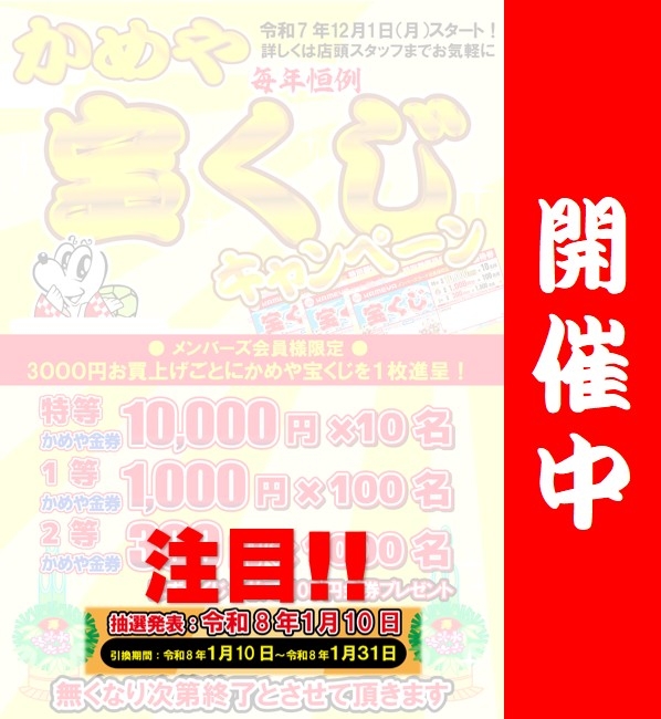 3,000円毎に、宝くじを差し上げております。抽選発表は?