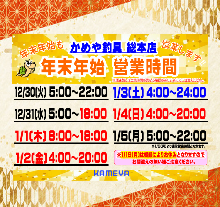 上記、かめや釣具 総本店の年末年始営業時間です!!👆