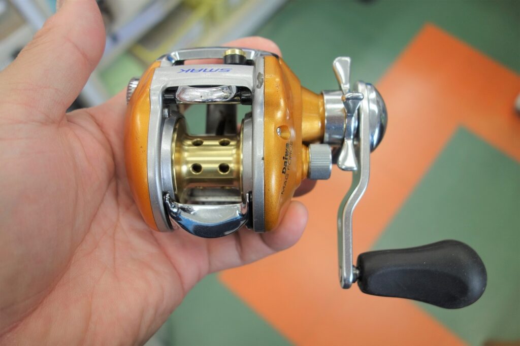これは懐かしいリールです!グローブライドのスマック100Rの中古リールが入荷!特に船のカワハギ釣りに便利なリールです!片手で糸が巻ける画期的なリールです!