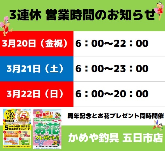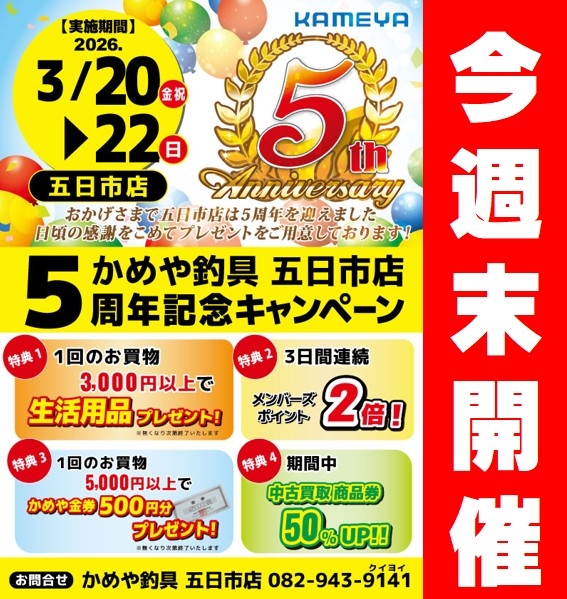 明日から、かめや釣具五日市店5周年記念キャンペーンが始まります。