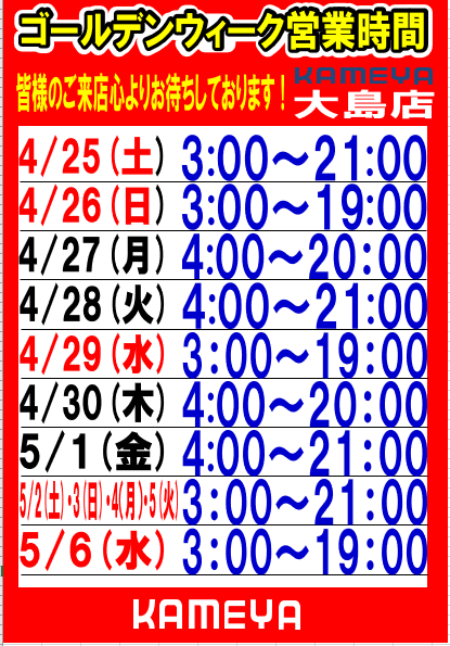 さてさてそんなゴールデンウィークですがまずは営業時間のご案内です(/・ω・)/