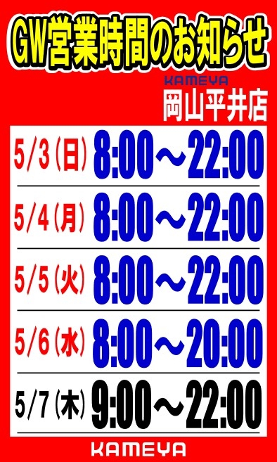 5/3(日)・5/4(月)・5/5(火) 8時~22時