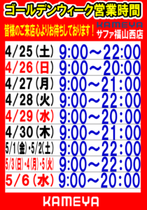 ゴールデンウィーク期間営業時間のお知らせ!!