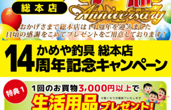 今週末も総本店ではイベント盛り沢山です!! まずは10/10㈮~10/13(月・祝)でかめや釣具総本店14周年記念イベントを開催しま…