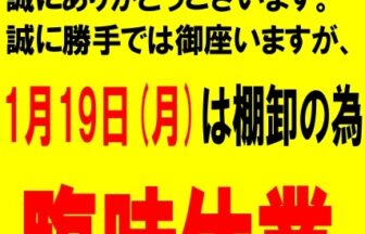 誠に申し訳御座いませんが、本日1月14日は棚卸につき店休日となります。お客様には大変ご迷惑をお掛け致しますが、ご理解ご協…