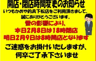 皆さんこんにちは。かめや釣具下松店です。本日と明日ですが、営業時間が変更となっております。大変申し訳…
