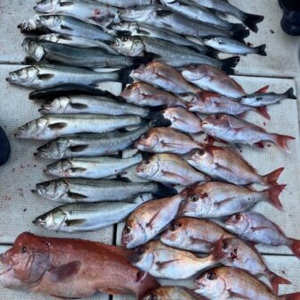 しまなみ海道方面にて真鯛の釣果です。最大45cmまでの真鯛が3匹、アコウが1匹の釣果です。釣法はひとつテンヤで、TG製の10号~12号を使用です。
