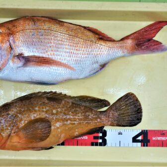 4月6日 大島大橋周辺でのタイラバに真鯛とアコウ釣れてます!ジャッカルのビンビンスイッチ100gを使用。オレンジ系のスカートに反応したそうです。釣果お持ち…